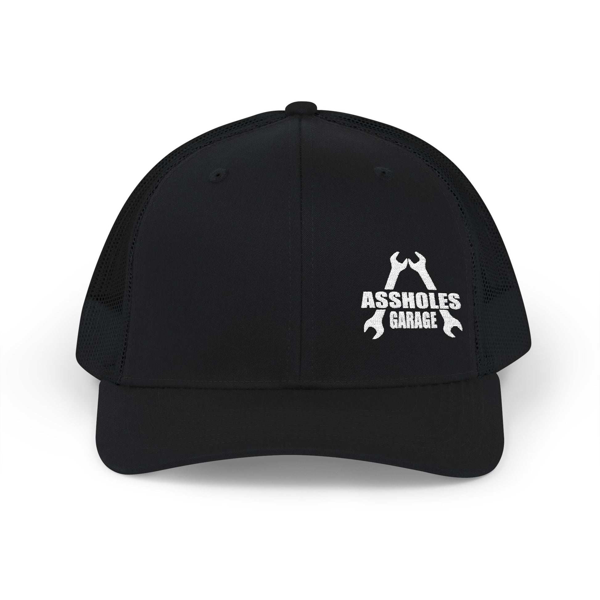 A rugged black-and-white trucker cap embroidered with a bold garage-themed logo. This structured mid-profile snapback blends classic workwear style with breathable mesh—made to be worn during hands-on projects, weekend wrenching sessions, or casual days out. The precurved visor and reinforced six-panel build keep the silhouette sharp while the cotton sweatband and adjustable snap closure make it comfortable and easy to fit. The high-contrast embroidery stands out against the solid front for a no-nonsense, authentic look that speaks to people who live for the garage and the craft of fixing things.